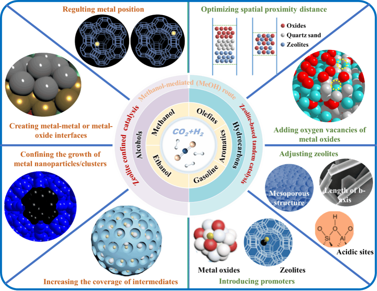 论文从分子筛择形催化的视角出发,全面而深入地阐述了近年来分子筛材料在CO2加氢领域内的最新进展与趋势。目前,通过热催化技术将CO2与绿色H2转化为高附加值的能源小分子和基础化学品,如醇类、烯烃和芳烃,是未来缓解全球气候变暖、实现双碳目标最有前途的战略之一。然而,CO₂加氢反应网络错综复杂,且在分子筛内部精准调控多个活性位点上的C-O键活化和C-C键耦联过程极具挑战性,因此开发兼具高活性与高选择性的催化剂依旧面临重重困难。目前,国内外的科学家们已探索了结合氧化还原型金属位点与分子筛酸性位点的双功能性,但这些探索尚缺乏系统性考量,以至于未能确立清晰的结构-性能关系。为填补这方面的空缺,该论文全面而批判性地概述当前关于分子筛限域金属型催化剂在醇类合成中的应用,以及通过甲醇介导路径在CO₂加氢过程中用于C2+烃类产物合成的分子筛串联催化体系的研究进展。特别地,着重评估了“氧化还原-酸”双功能催化体系内的限域效应与邻近效应对催化性能的影响,尤其是对产品分布的调控作用,并从机理层面进行深入剖析。最后,文章不仅详尽探讨了催化过程中各催化剂组分间的协同作用,还为促进新型或改良型催化剂系统的理性设计提供了极具价值的洞见与启示。鉴于分子筛在二氧化碳加氢转化过程中所面临的挑战与潜在机遇,该综述为推动构建可持续、高效的CO2资源化利用贡献力量,助力实现环境友好型化学工艺的发展。