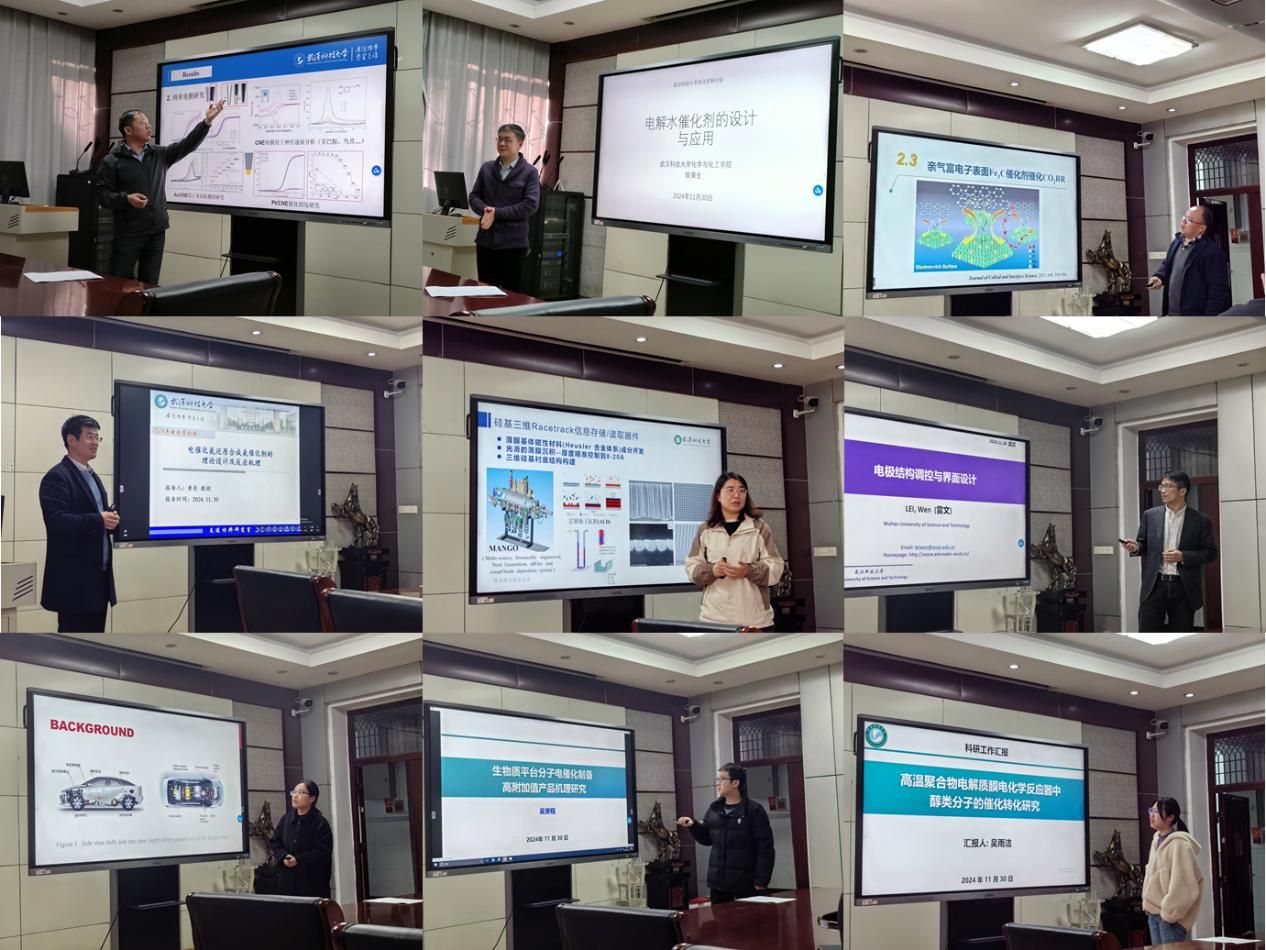 在随后的报告环节中,资源与环境学院的钱功明教授以“多功能纳米电极制备及其多模传感分析”为题,率先分享了团队的研究进展,详细阐述了纳米电极在环境监测和能源应用中的广阔前景。威廉官网中国官方网站的陈荣生教授则带来了关于“电解析氢催化剂的设计与应用”的精彩报告,提出了新型催化剂的设计思路,为电催化析氢领域提供了新启示。鲁礼林教授以“Bi/Fe/Cu金属催化剂结构调控及电催化CO2/NO3还原研究”为题,探讨了金属催化剂在环境友好型电催化反应中的最新进展,为减排和资源循环利用提供了新方案。黄亮教授的报告“电催化氮还原合成氨催化剂的理论设计及反应机理”,以其前沿性和理论价值引发了与会者的深入探讨。他从反应机理到理论设计全面介绍了这一研究方向,为后续研究提供了重要参考。此外,高天副教授、雷文副教授和何敏副教授等来自不同学院多位学者的报告从微观材料设计到宏观性能优化,为新型电催化剂和电化学储能等领域的研究提供了全面的视角。