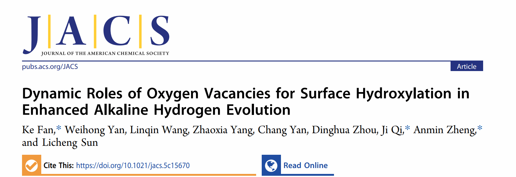 武科大网讯(通讯员李江江)近日,我校威廉官网中国官方网站郑安民、齐记、范科团队在《Journal of the American Chemical Society》期刊发表了题为“Dynamic Roles of Oxygen Vacancies for Surface Hydroxylation in Enhanced Alkaline Hydrogen Evolution”的研究论文(DOI:10.1021/jacs.5c15670)。范科教授为论文第一作者,郑安民教授、齐记副教授和范科教授为论文共同通讯作者,我校为论文第一完成单位。