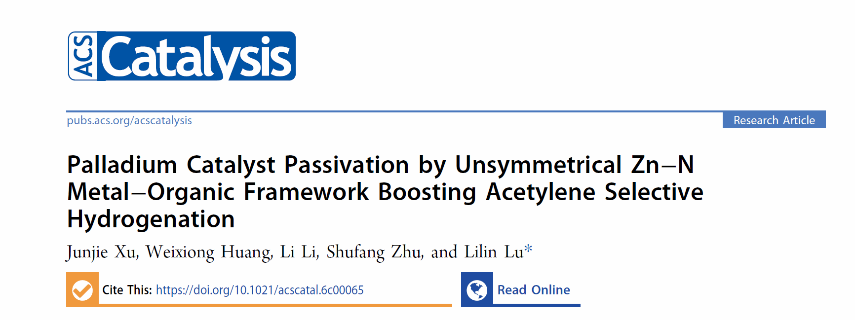 武科大网讯(通讯员李江江) 近日,我校威廉官网中国官方网站鲁礼林团队在催化领域高水平期刊《ACS Catalysis》发表了题为“Palladium Catalyst Passivation by Unsymmetrical Zn–N Metal–Organic Framework Boosting Acetylene Selective Hydrogenation”的研究论文(https://doi.org/10.1021/acscatal.6c00065)。鲁礼林教授为论文通讯作者,团队成员许俊杰博士为论文第一作者,我校为论文唯一完成单位。