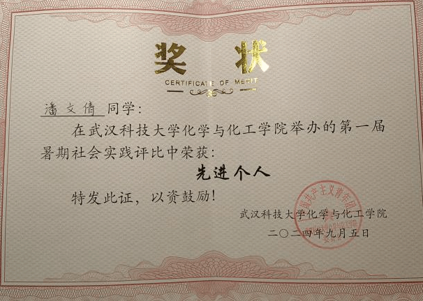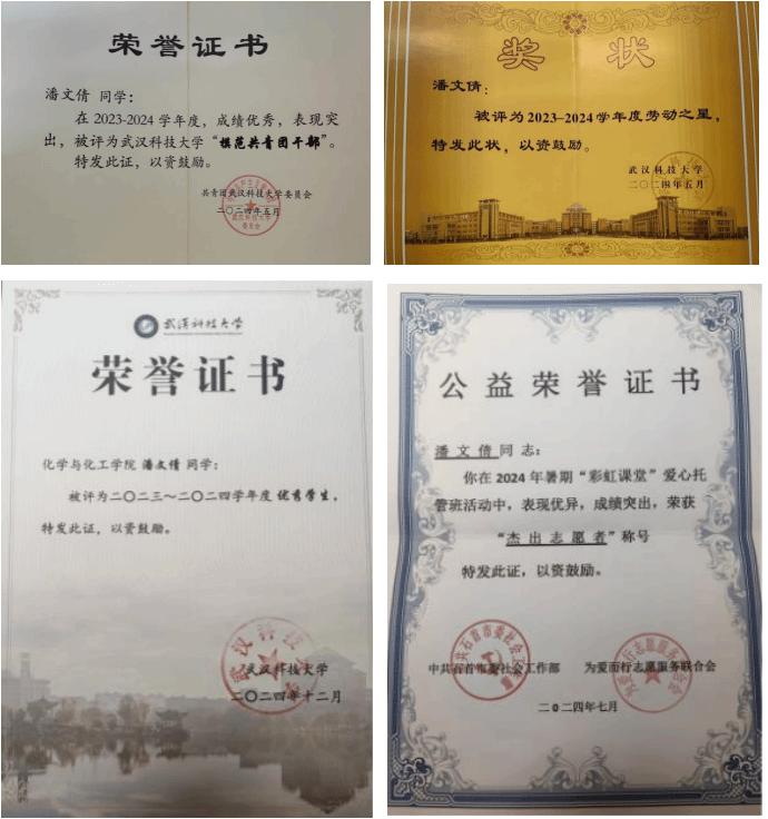 作为新时代共青团员,潘文倩思想积极,不断进取,入学后主动提交入党申请,经团组织推优和党支部培养考察,于2023年11月被确定为入党积极分子,2024年11月被列为发展对象。她始终严格要求自己,热爱同学,尊重师长,将“服务他人,奉献社会”的信念镌刻于心,获评2023-2024学年度武汉科技大学“模范共青团干部”等荣誉。在生活上,潘文倩乐观积极,有良好的生活习惯,与人为善,勤俭节约,热爱劳动,2023-2024学年度被评为“劳动之星”。在学习上,潘文倩勤奋刻苦,努力钻研,以“学以致用,服务社会”为求学准则,专业成绩稳居专业前列,获得了2023-2024学年度校“三等优秀学生奖学金”并获评“优秀学生”。